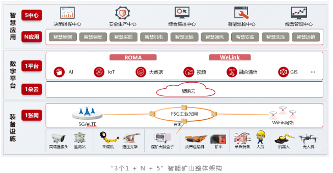 此次發(fā)布的華為智能礦山聯(lián)合解決方案,不僅引入了行業(yè)領先的5G、AI、鯤鵬云等新ICT技術,還融合了煤炭行業(yè)內(nèi)智能礦山建設豐富專業(yè)的實踐經(jīng)驗,形成了“3個1 + N + 5”的智能礦山整體架構(gòu),即礦山一張網(wǎng)、礦山一朵云、礦山一平臺、以及N個應用與5個中心。