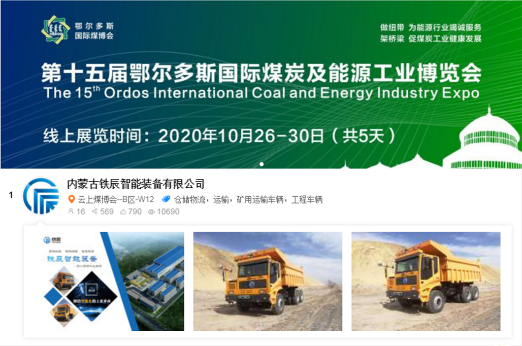 2020年10月26日至10月30日,為期五天的第15屆鄂爾多斯國際煤炭及能源工業(yè)博覽會通過云端進行線上展覽,包括內(nèi)蒙古鐵辰智能裝備有限公司在內(nèi)的國內(nèi)外300多家行業(yè)內(nèi)部知名企業(yè)參展。